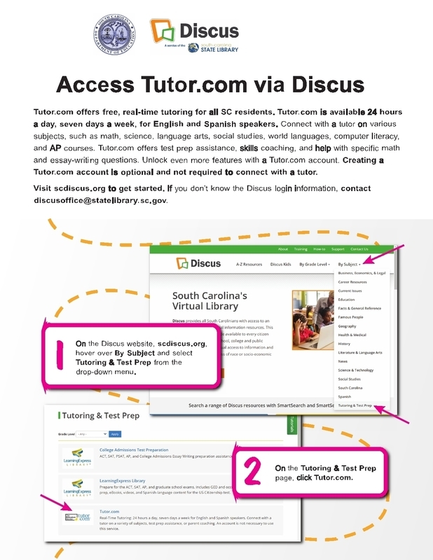 Tutor.com offers free, real-time tutoring for all SC residents. Tutor.com is available 24 hours a day, seven days a week for English and Spanish speakers. Connect with a tutor on various subjects such as math, science, language arts, social studies, world languages, computer literacy, and AP courses. Tutor.com offers test prep assistance, skills coaching, and help with specific math and essay-writing questions.